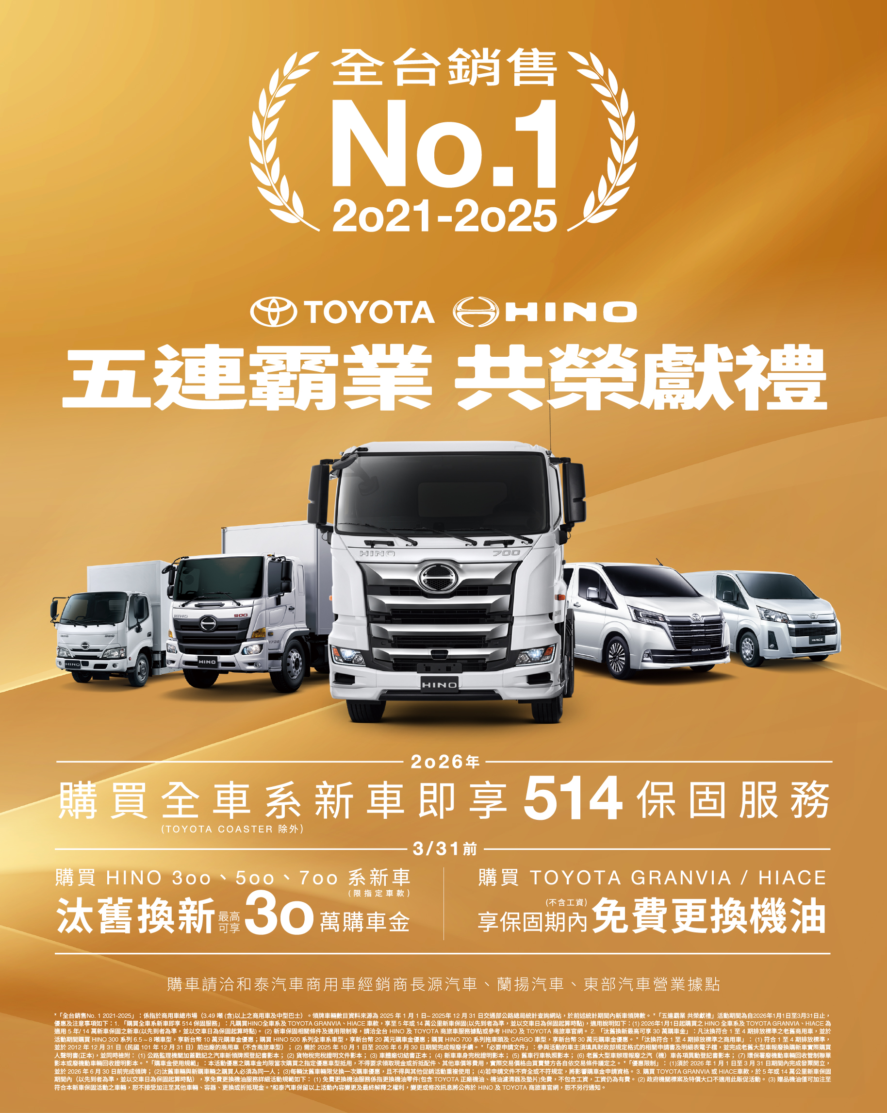 「五連霸業 共榮獻禮(註2)」於2026/1/1起購買HINO全車系及TOYOTA GRANVIA、HIACE車款,即享5年或14萬公里新車保固(註3)(以先到者為準),全面守護所有顧客。另於2026/1/1至3/31期間,凡汰換符合1至4期排放標準之老舊商用車,並購買HINO 300系6.5~8噸,享NT$10萬元購車金、購買HINO 500系全車系,享NT$20萬元購車金、購買HINO 700系拖車頭及CARGO車型,享NT$30萬元購車金回饋(註2)。