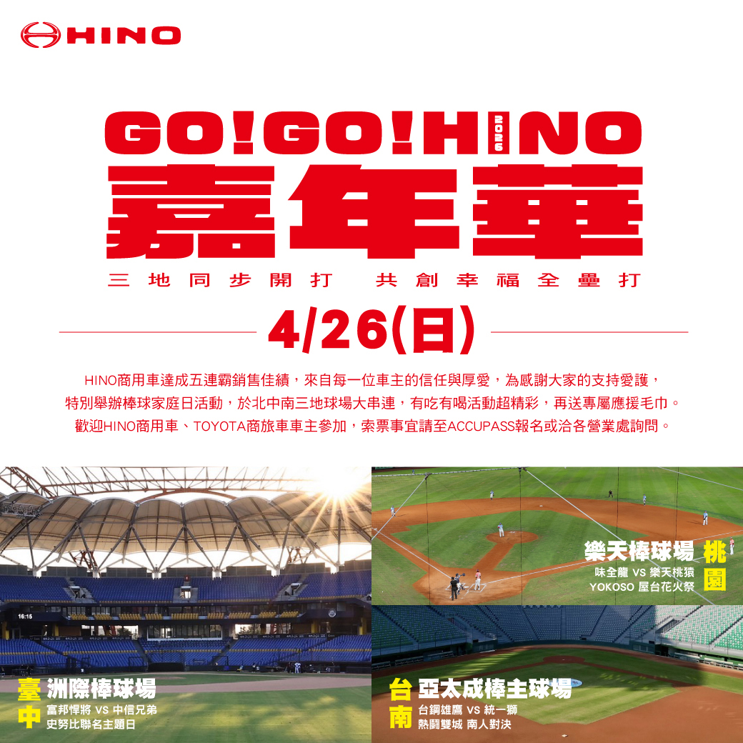 2026年GO!GO!HINO嘉年華4/26於北中南球場同步熱血開打,邀約全台車主同樂應援