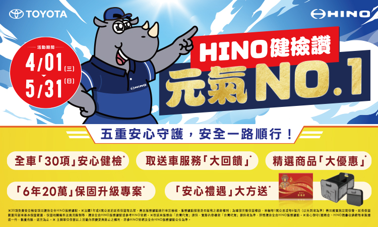 (註1)30項免費安全檢查項目依各服務廠規定為準,詳情請洽全台HINO服務據點。