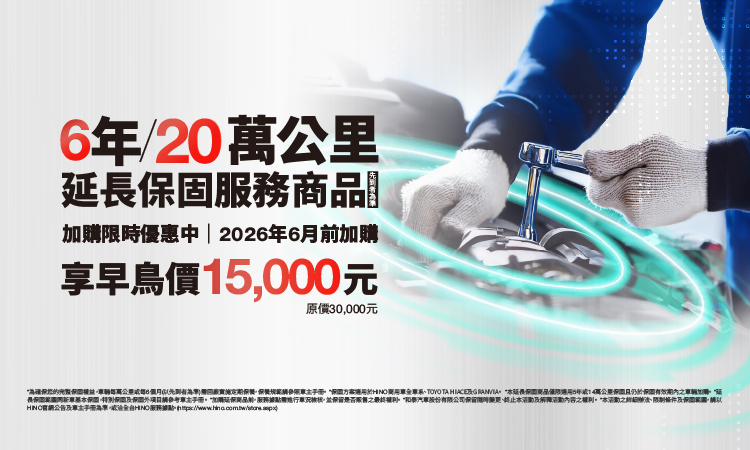 (註2)加購1年或6萬公里的延長保固商品前,需至服務據點進行車況檢查,服務據點保留是否販售之最終權利;為確保完整保固權益,車輛每1萬公里或每6個月(以先到者為準)需回廠實施定期保養。延長保固範圍同新車基本保固範圍,保固相關條件及適用限制等,請洽全台HINO服務據點或參考HINO官網。
