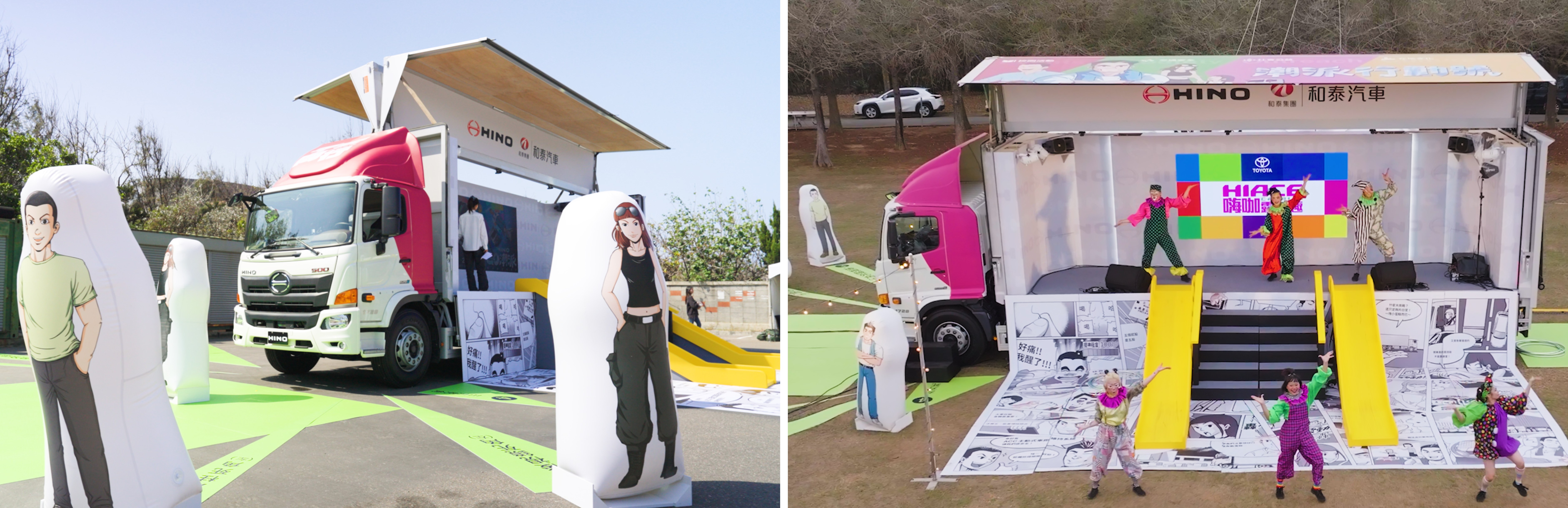 相較於傳統展覽形式,「潮派行動號」的關鍵在於「移動」。透過行動載體,HINO將品牌從單一場域延伸至不同生活情境,使溝通不再受限於地點與族群,而能在各種場景中發生。「潮派行動號」以 HINO 500 系17噸鋁合金鷗翼大貨車為基礎打造,透過車體改裝整合展示、互動與展演功能。外觀設計融入品牌社群長期經營的「大車人生漫畫」角色,透過視覺轉譯降低大型車帶來的距離感,建立更具親和力與識別度的品牌形象。